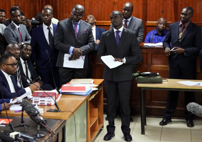 People follow court proceedings as the Officer Commanding Station (OCS) of the Central Police Station, Samson Talam appears over the death of Kenyan blogger Albert Ojwang who died in police custody, at the Milimani Law Courts in Nairobi, Kenya, June 16, 2025. REUTERS/Monicah Mwangi Purchase Licensing Rights