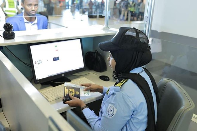 FILE - A Somali immigration officer processes a passenger's passport at Mogadishu's international airport. As part of new security measures, the Somali government will require airlines to submit Advanced Passenger Information (API) and Passenger Name Record (PNR) data to enhance border control starting March 2025. Credit: Daud Aweis/Minister of Information, Culture and Tourism