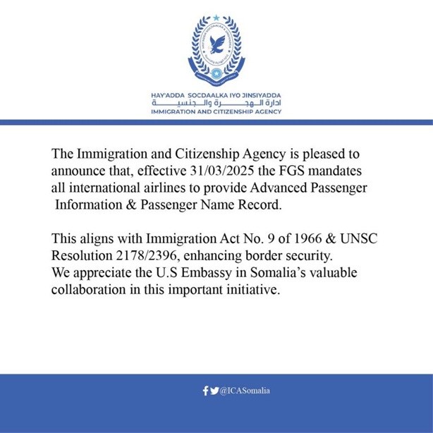 Somalia has faced significant security challenges, particularly from al-Shabaab, a terrorist group linked to al-Qaeda. The group has exploited weaknesses in the country’s security, including its borders. The introduction of API and PNR requirements is part of a broader global effort to prevent the movement of foreign terrorist fighters, with international partners, including the United Nations, urging countries like Somalia to adopt data-sharing practices.The U.S. State Department has issued travel advisories for Somalia due to ongoing concerns about terrorism and crime, emphasizing the importance of stronger border control measures. The new policy is expected to strengthen Somalia’s security infrastructure and help combat threats posed by al-Shabaab and other extremist groups.