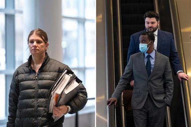 Defendant Amy Bock, left, and Said Salim, front right, enter the federal courthouse in downtown Minneapolis on March 18, 2025, for closing arguments in the Feeding Our Future trial. Credit: Aaron Nesheim | Sahan Journal