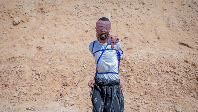 Nur Hirsi Warsame, convicted of premeditated murder, stands blindfolded and bound before his execution by firing squad in Galmudug, central Somalia, on Thursday, Oct. 9, 2025. Regional authorities said the sentence, upheld by the Galmudug Supreme Court, was carried out in accordance with Somali law and witnessed by officials, religious leaders, and relatives from both families. (SUPPLIED)