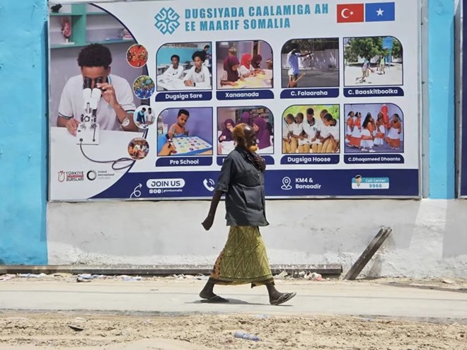 A woman walks past a Turkish-run school in Mogadishu on Aug. 2. Such schools have increased in numbers over the years.Mohamed Gabobe for Foreign Policy