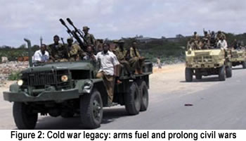 Now let us turn the clock of the world history to the cold war era and let us read the Somali conflict through the lenses of that world structure. You will immediately see how Somalia, like many other post-colonial states, was caught in the whirlwind of that mighty power structure. History tells us that the big powers (USA and former USSR) used Somalia as a fertile ground for conducting and executing their political policies in their contest to prove the validity or the supremacy of their ideologies, e.g. communism v. capitalism! As a result of that, a bloody proxy war was fought in the region and many thousands of Somalis and Ethiopians were killed in the Ogaden war. Although there were many legacies from that power-structure, the worst legacy for Somalia and indeed for the whole region was the huge weaponry that was deployed in the region. To protect their strategic and security interests in the region, the former-USSR and USA-Western Europe had all carelessly supplied massive military arsenal to prop up the Mengistu and Siad regimes. Somalia, like many other developing nations, played its card to promote and protect its national interests, shifting its allegiance and alliance between the big powers. It was well known that Somalia once had the biggest army in the region where Russian-made MIG jet fighters were on display to either intimidate or quell the enemy. It has now been accepted that the Ogaden war was the beginning of the end of the Mengistu and Siad regimes, and that the civil war in Somalia started immediately after that. It has also been accepted that the huge military arsenal played a major role in fuelling and prolonging the civil war. After the collapse of the military regime, basically the whole country was swamped with deadly weapons from AK4 to bazookas and markets in big cities such as Mogadishu became arms market.