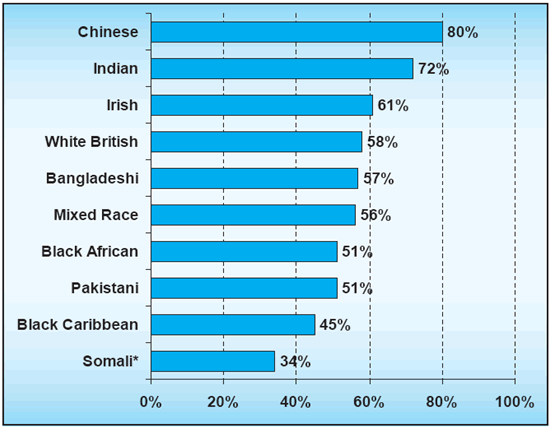 • At Key Stage 4, 43% of Somali children were gaining 5+A*-C compared to 60% of White British pupils, 56% of African pupils, 49% of Black Caribbean pupils and 74% of Indian pupils.