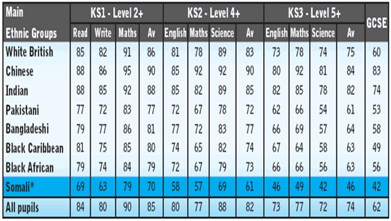 • At Key Stage 2, 61% of Somali children were gaining level 4 or above compared to 83% of White British pupils, 73% of African pupils, 74% of Black Caribbean pupils and 85% of Indian pupils.