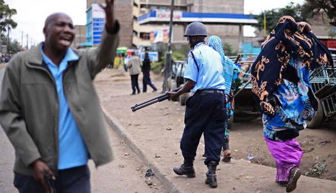 Kenyan police officers escort Somalis through Eastleigh on November 19 2012. Violence erupted after a bomb explosion the previous day, which Kenyans accused Somalis of being responsible for. (AFP)