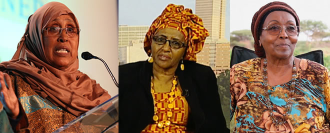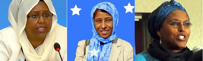 Somalia's first female Foreign Minister Fowzia Yusuf Haji (L), lawyer representing Somalia's maritime dispute against Kenya Muna Sharmaan (C), former Governor of the Central Bank of Somalia Yussur Abraar (R)