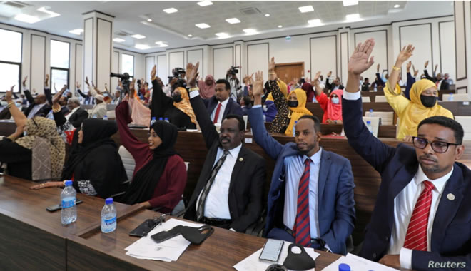 Somali legislators of the lower house of parliament raise their hands to vote to extend President Mohamed Abdullahi Mohamed's term for another two years, in Mogadishu, April 12, 2021.