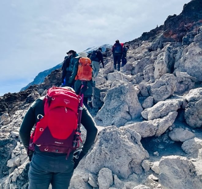 Kilimanjaro waa Buurta Africa u dheer, Buuraha aduunkana waa tan AFRAAD dhererka. Dhererkeedu waa 19345 feet (ama 5895 mitir (meters). Barta ugu sareysa buurta waxaa la dhahaa Uhuru Peak, waxayna nagu qaataday lix (6) maalin oo inaan kor loo socdey iyo hal maalin iyo bar oo dhaadhac ah. Waxay noo ahayd waayo aragnimo cajiib ah. Wax yar maaha in usbuuc dhan aad buur kor ugu socoto, maalin walba, ilaa 8 sacaadadoo iyo kabadan oo isdabajoog ah. Xanuunka muruqyada waxaa ku lamaanan dhaxan, hordo xumo iyo nadaafad xumo. Dhibta ugu weyn ee laga cabsoodo waa xanuun lagu magcaabo altitude sickness (jirrada ka dhalata koritaanka meel aad u saraysa). Waxaad dareemeysaa jaahwareer, aragti xumo, madax xanuun iyo qaar matag, waxaana dhici karta in neefta kugu dhegto sabatoo ah oxygen/ogsijiinka oo kaa sii yaraado markaad ku u sii kacdo.