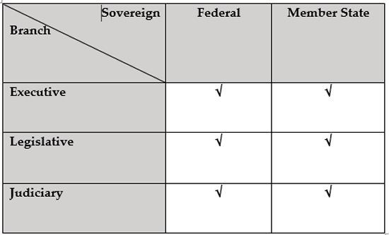 government with separation of powers between the federal and member states and between