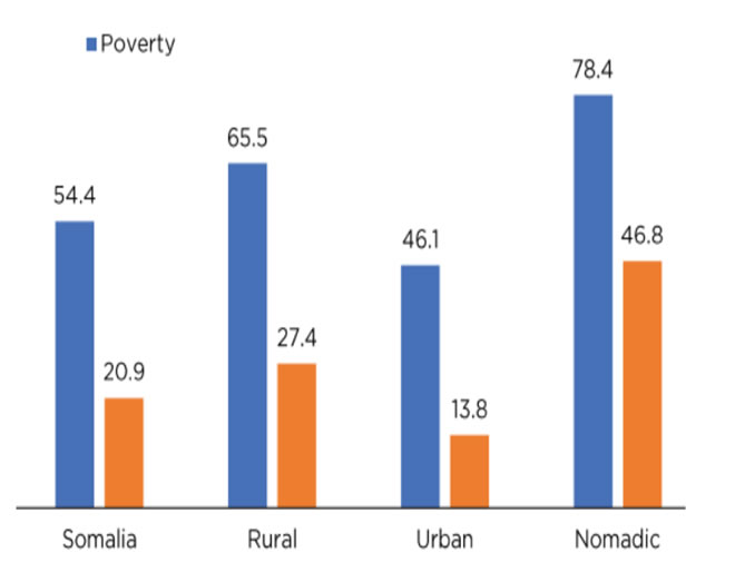 The current "Somalia Poverty and Inequality Report 2023, released by the Somalia National Bureau of Statistics (SNBS), disclosed that 54.4% of Somalis live below the national poverty line and make less than $2.06 per day, with 20.9% of the population living on less than $1.16 per person daily. Therefore, there is a severe issue in the country due to this extreme poverty because Somalia's agricultural and productive zones are some of the most susceptible to droughts and displacements.