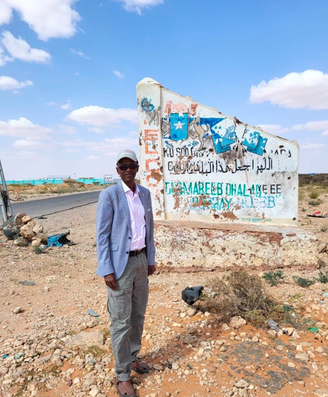 Dr Yusuf Sheikh Omar is standing at the entry gate to Dhusamareb is inscripted with a quote from the Quran that reads “O My Lord, make this a peaceful land, and provide its people with fruits”